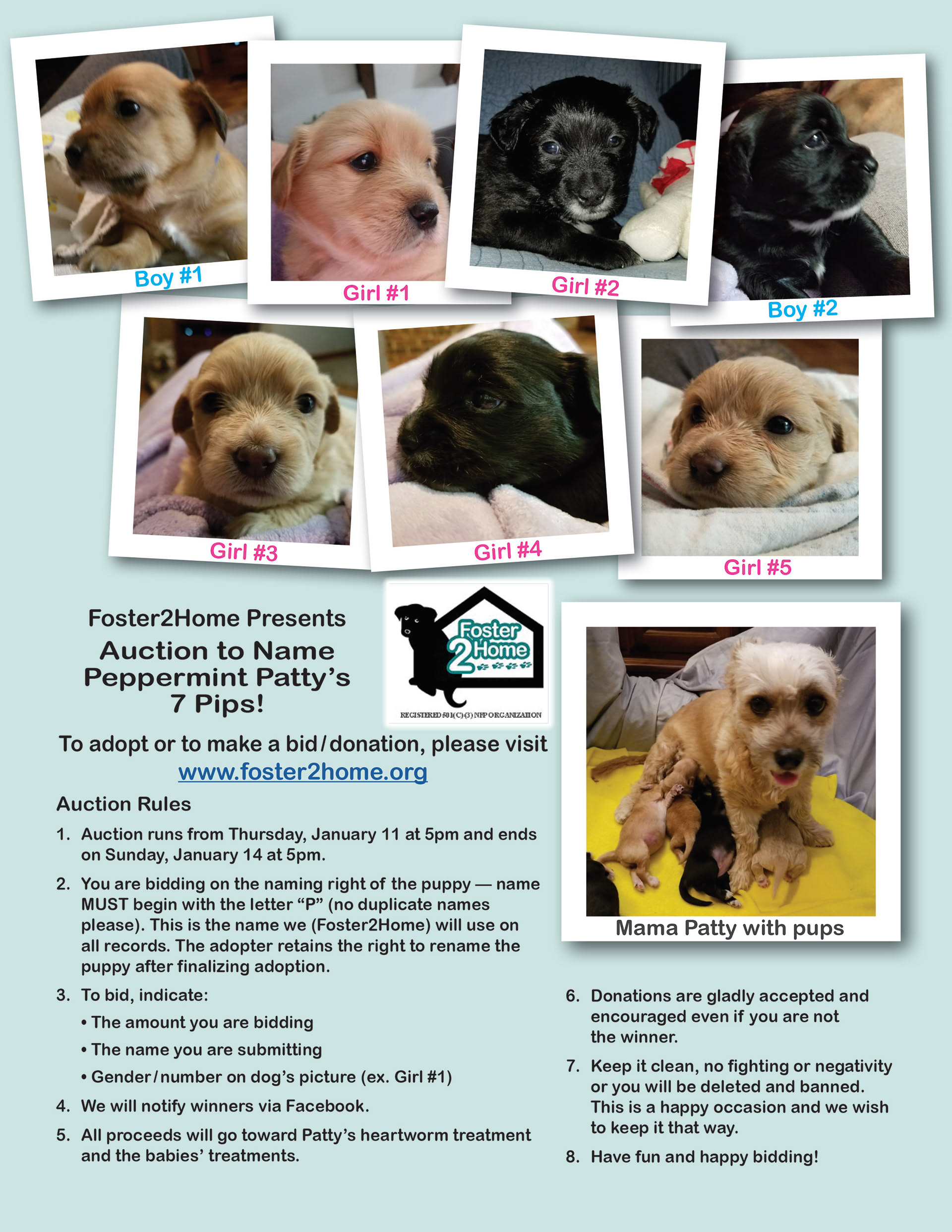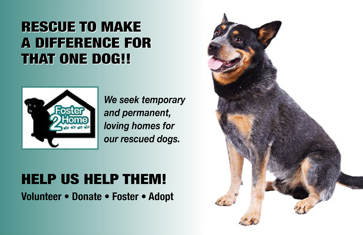 I am a volunteer with Foster2Home, a 501c3 non-profit charity that rescues homeless dogs and finds homes for them. I have designed several flyers for various events.